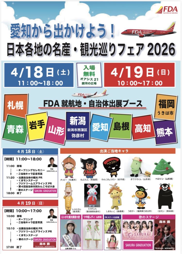 FDA フジドリームエアライン 第12回 日本各地の名産・観光巡りフェア2026に出演いたします! 森本爵のステージは、 2026年4月19日(日)14:55〜15:15となります! 会場:オアシス21「銀河の広場」 入場無料です✨ ぜひお越しください!